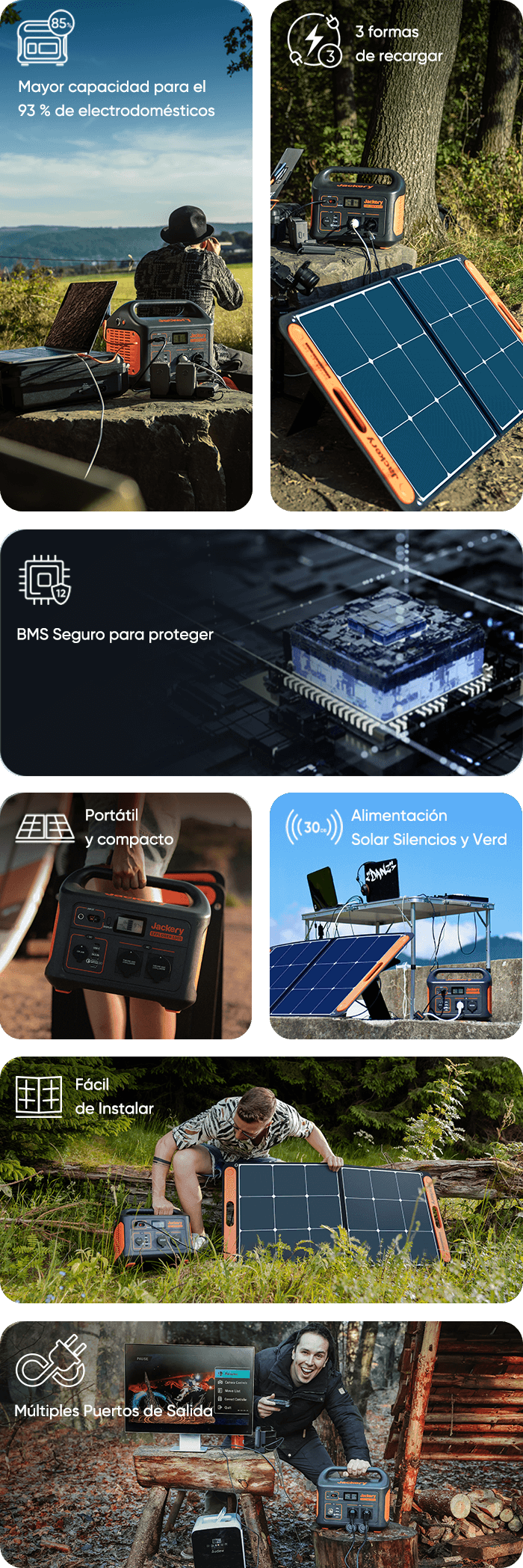El Generador Solar 1000 de Jackery es una solución energética que combina la Estación de Energía Portátil Explorer 1000 de Jackery y los paneles solares SolarSaga100W. Este convierte la energía capturada por los paneles solares SolarSaga 100W en energía eléctrica, y luego la almacena en la Estación de Energía Portátil Explorer 1000 para su posterior uso. Este generador solar es una fuente de energía fiable y limpia para los campistas, vehículos recreativos, o como una copia de seguridad de emergencia si se va la luz.